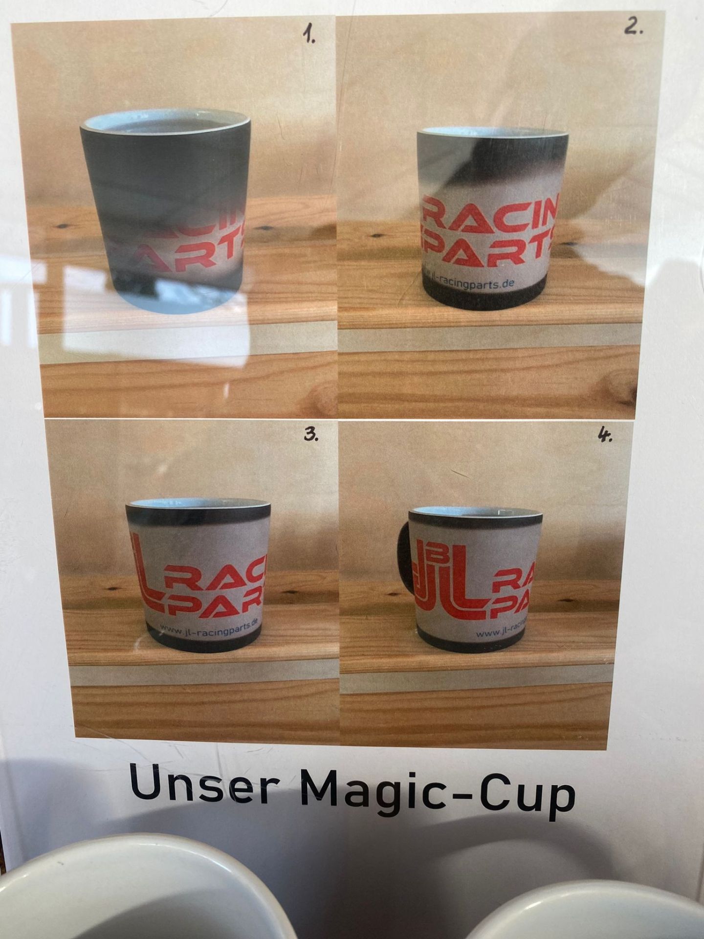 Keramiktasse mit Magicfunktion, wenn Heißgetränke eingefüllt werden erschein das darunter liegende Bild wie durch Zauberhand.